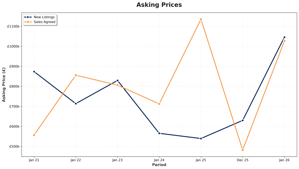 Average asking prices in January 2026 reached £1,045,375, up 94.0% from January 2025 (£539,000). While this appears dramatic, it reflects the smaller number of properties listed and their position at the high end of the market, rather than widespread price inflation.