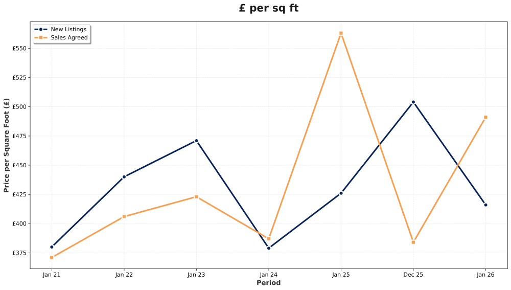 The average price of properties going under offer was £1,026,429, slightly down from £1,135,000 in January 2025, while price per square foot for agreed sales stood at £491, higher than the asking average of £416. This unusual dynamic reflects the type of properties being listed versus those selling — larger, premium homes are dominating the transaction pool.