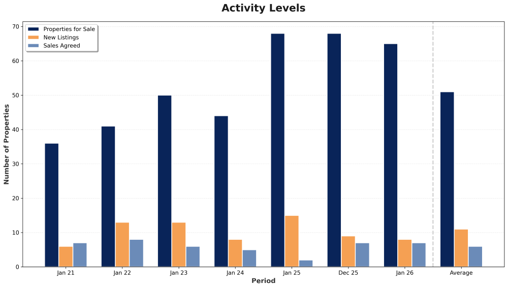 Comparing December 2025 (68 properties, 9 new listings, 7 sales agreed) with January 2026 (65 properties, 8 new listings, 7 sales agreed) shows remarkable stasis. The lack of a new year uplift is unusual and underscores subdued buyer activity rather than typical seasonal effects.