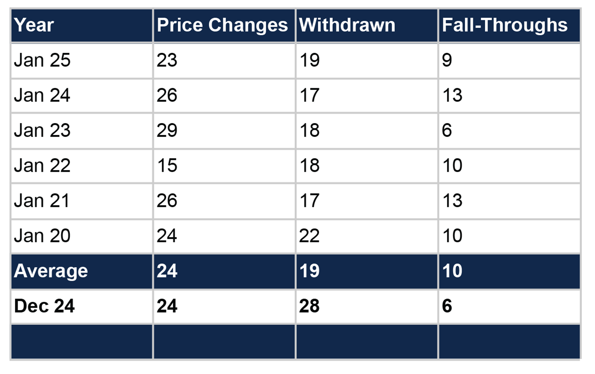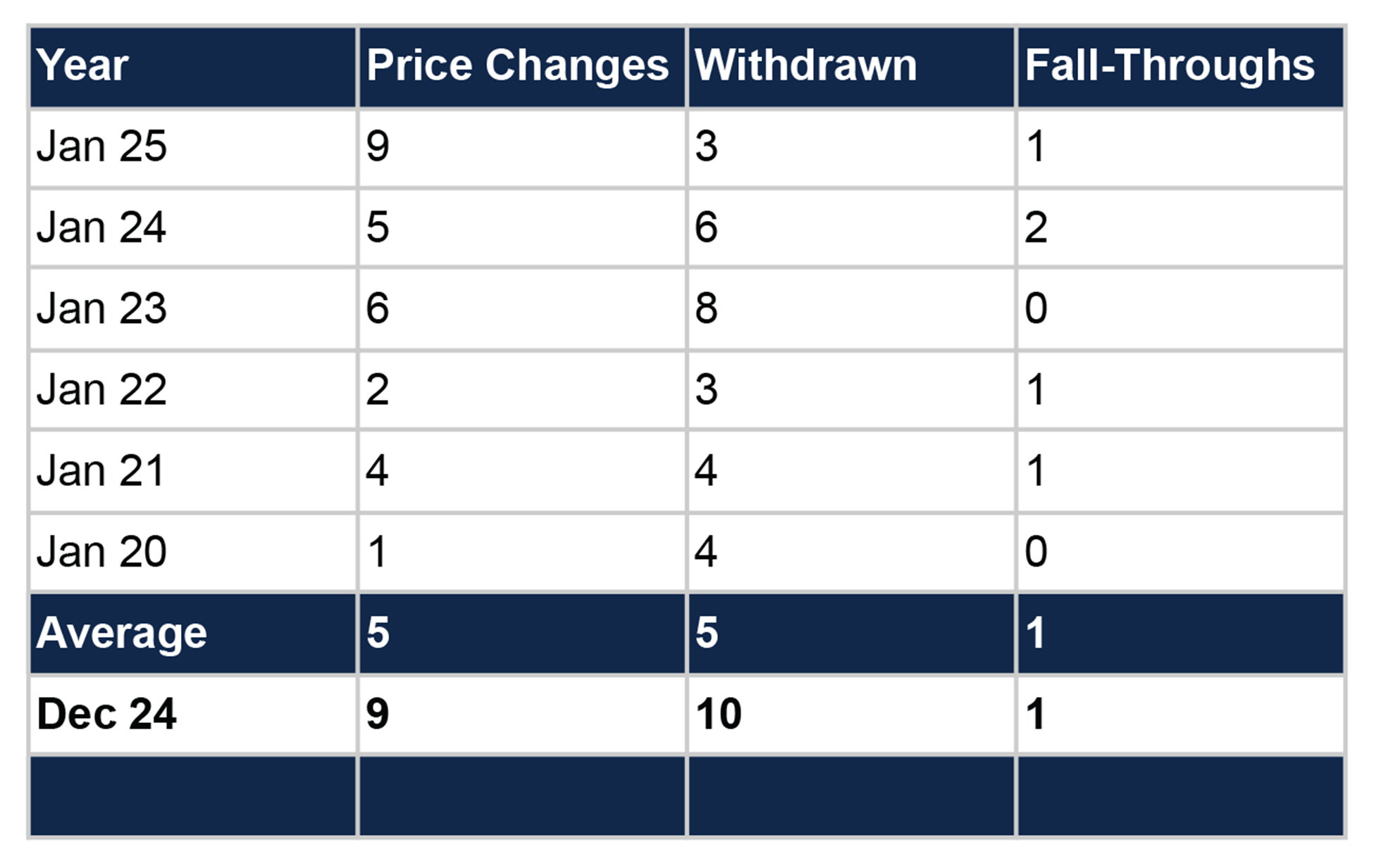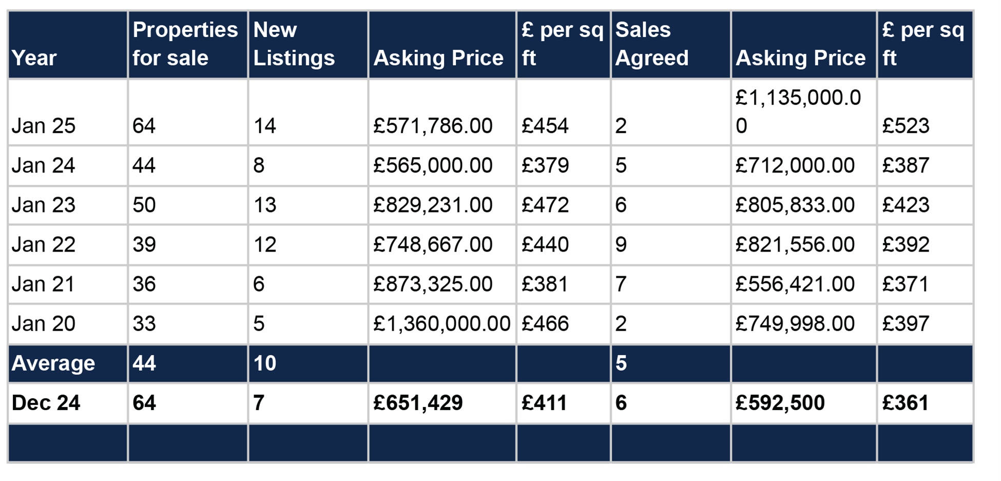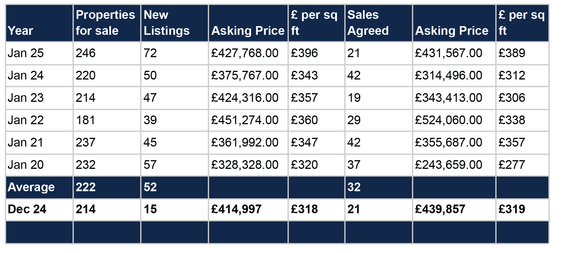 - Properties for Sale: Average of 222 listings (e.g. Jan 25: 246, Jan 24: 220).