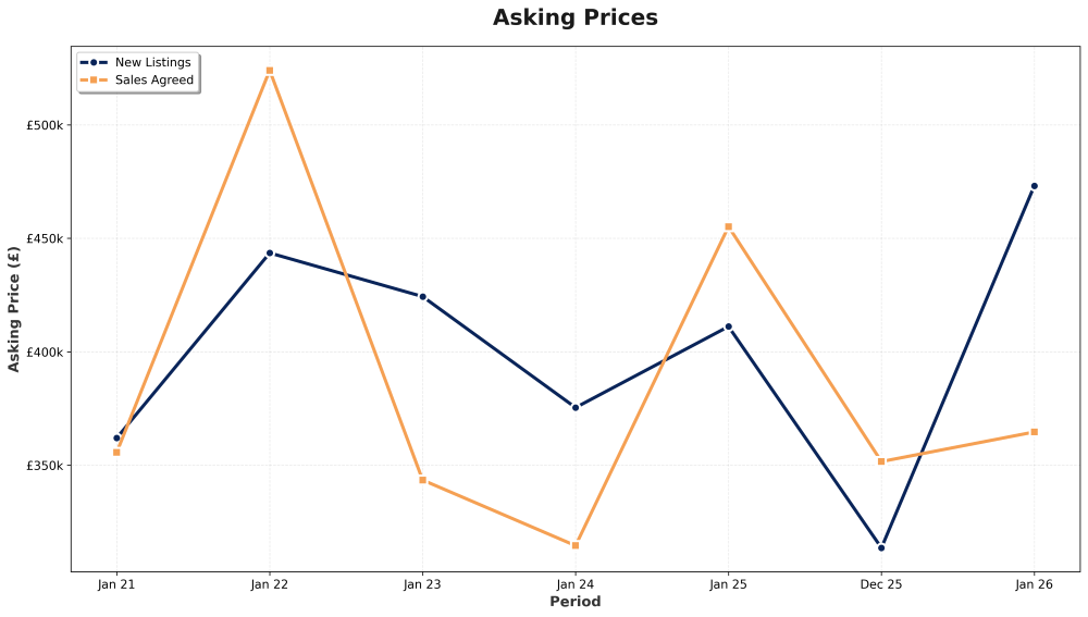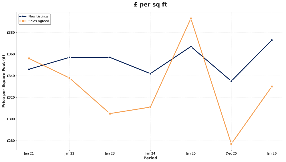 The average achieved price was £364,615, down 19.9% from £455,155 in January 2025, while price per square foot for sales agreed properties stood at £330, a 16% decline from £393 in January 2025. The 13% gap between asking and achieved price per square foot suggests negotiation is key and that transacting properties differ in size, quality, or condition from newly listed homes.