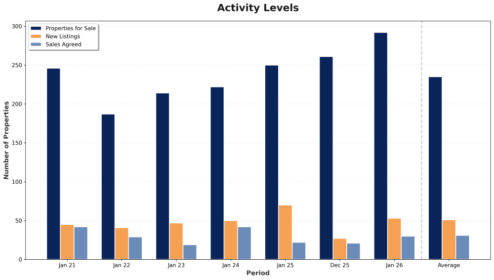 In January, 292 properties were available for sale, up 16.8% from 250 in January 2025. This expansion sits well above the long-term average of 235 and reflects the build-up of stock as transaction velocity has slowed. Buyers now have substantially more choice, creating opportunities for those prepared to search carefully and negotiate thoughtfully.