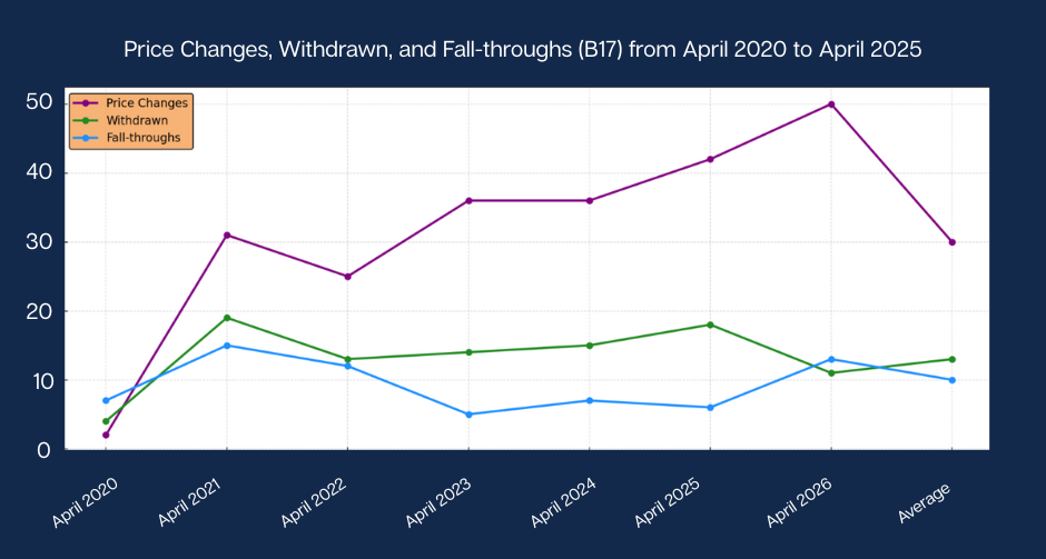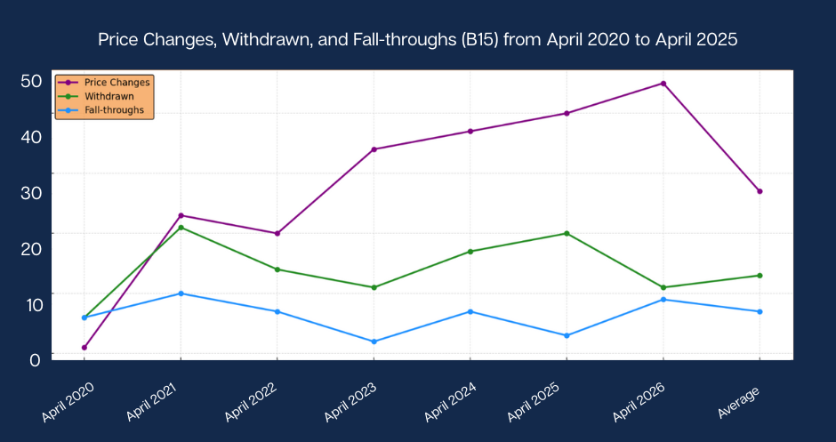 That said, Harborne did not escape volatility. Price changes were up nearly 39% on the year, and fall-throughs, a key indicator of fragile buyer commitment, rose sharply by 85.7%. This suggests that, while pricing is more balanced, transaction stability remains a concern across both markets.