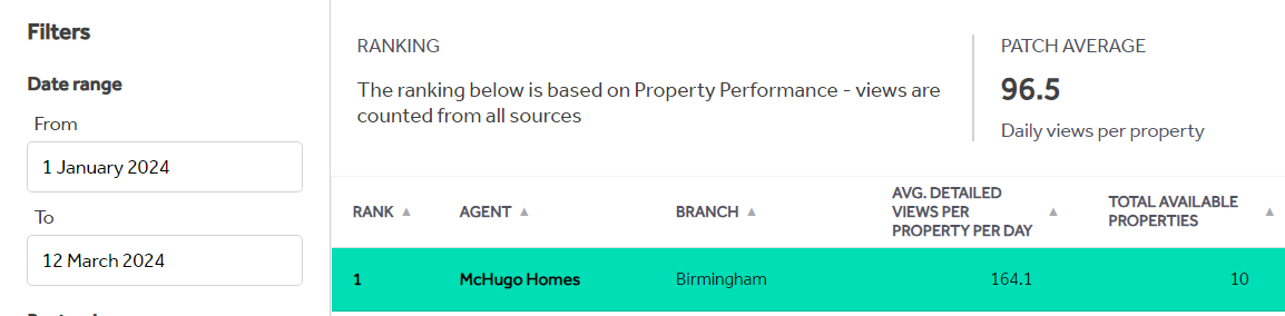 The attached image is from Rightmove highlighting the average views per day of each of our premium market (over £500k) listed properties in Harborne and Edgbaston for the year to date, showing: