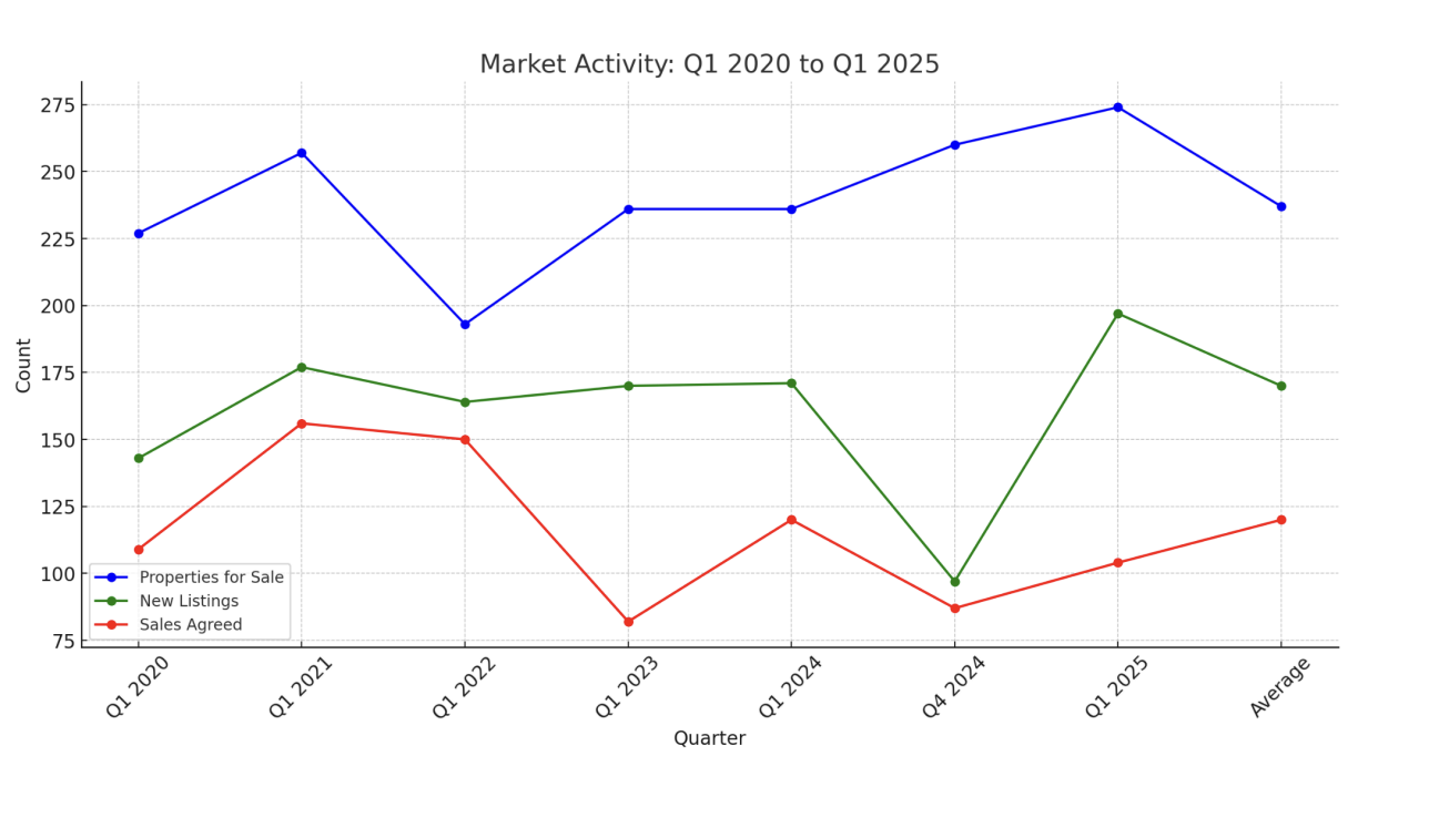 This tells a story of increased supply and firm seller confidence, but a slight drop in buyer urgency. With more homes available, buyers have become more selective, leading to a fall in agreed sales despite stronger pricing.
