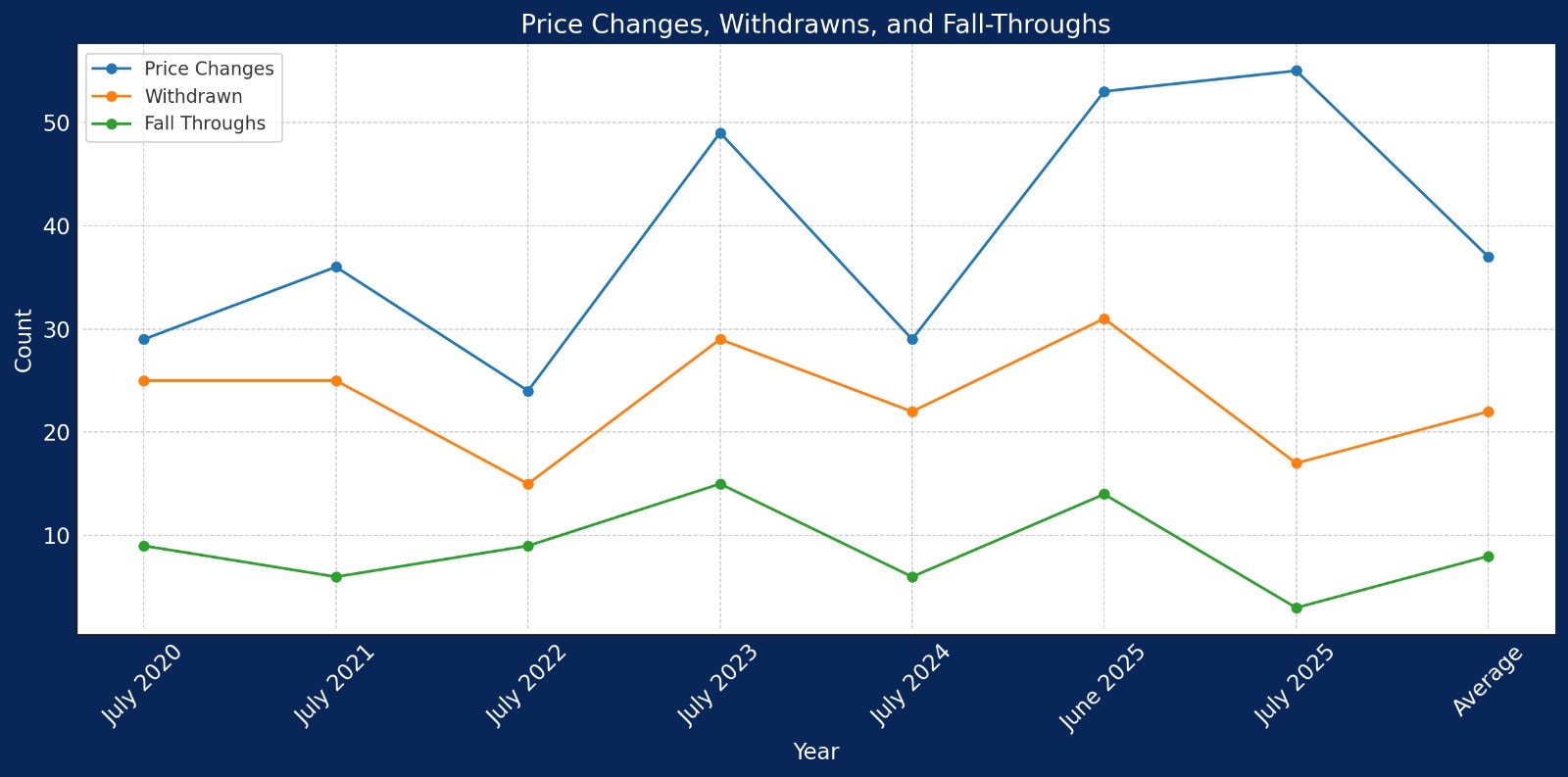 In Edgbaston (again based on houses only), 8 homes were withdrawn in July and 6 sales collapsed before completion, often a sign of initial overpricing or potentially changes in circumstances/issues uncovered that weren’t able to overcome. Harborne saw nearly double the number of price changes compared to last year (a national trend with a record number in July across the country), but far fewer withdrawals and fall-throughs, suggesting both committed vendors and greater stability once a deal is agreed.