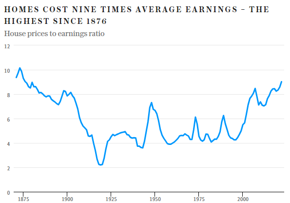 House prices are now at a startling 9 times the average earnings, marking the highest ratio since 1876.